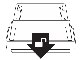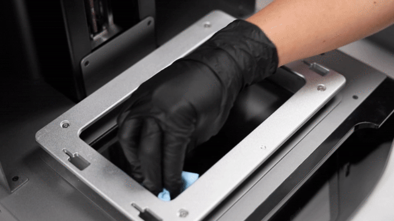 To clean the tank, begin by removing the tank from its cradle in the printer. Gently pull toward you to unlock and then lift up to remove the resin tank.