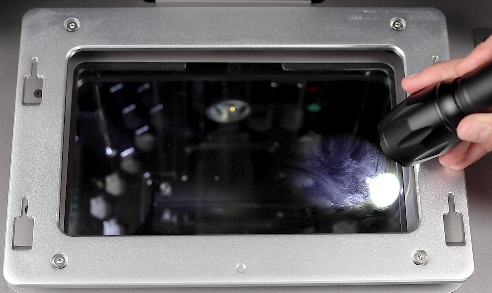 The glass can appear perfectly clean in normal overhead lighting conditions, even when it is not. Shine a bright flashlight on the glass to verify cleanliness.